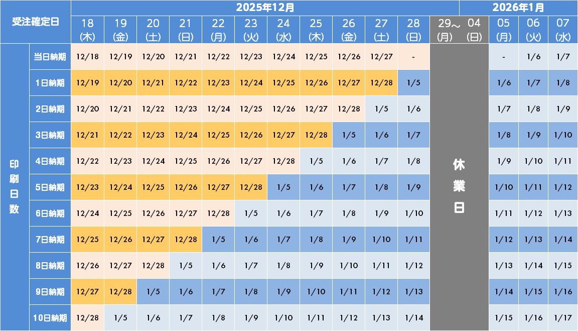 ※年始の受注確定日は2026年01月05日(月)以降 となりますが、データチェックを先行して作業する場合がございます。